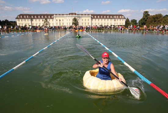 En esta competencia lo importantes y llamativo es la calabaza que se le abre un gran agujero por el que cabe una persona y se vacía completamente de forma que al vegetal solo le quede la cascara. Luego el valiente competidor entra en ella y lo que debe hacer es remar y dirigir la calabaza que aunque parezca sencillo, no lo es, ya que mantener el control es bastante complicado. Estas calabazas nunca obedecen a la dirección que les mandas ir, además tienes que mantenerlas lo suficientemente derechas como para que no se llenen de agua. Se comportan de forma caprichosa y constantemente te amenazan con volcarse. Los concursantes deben tener habilidades para nadar.