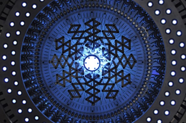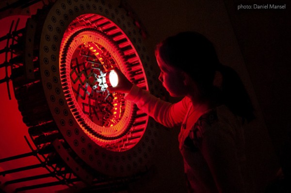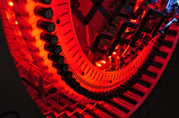 Los interruptores integrados en el circuito de la escultura son activados por el mango magnetizado y traduce su movimiento en un despliegue de 96 luces LED rojas y blancas… Durante los últimos cuatro años Kirsch estima que dedicó cerca de 800 horas en la construcción de la pieza, mecanizando casi todos los componentes de aluminio y acero manualmente.
