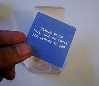 Tenían además que encontrar la manera de asegurarse de que los invitados indicaran el tipo de comida que habían pedido en el RSVP, ya que los platos eran limitados a lo que habían pedido inicialmente en la respuesta a la invitación. Supongo que la preocupación real, era que cuando los mesoneros sirvieran la comida (había 5 tipos diferentes), no se confundieran, y la gente terminara comiendo algo que no ordenó. Así que esta fue la solución que se les ocurrió para indicar lo que cada invitado había pedido.